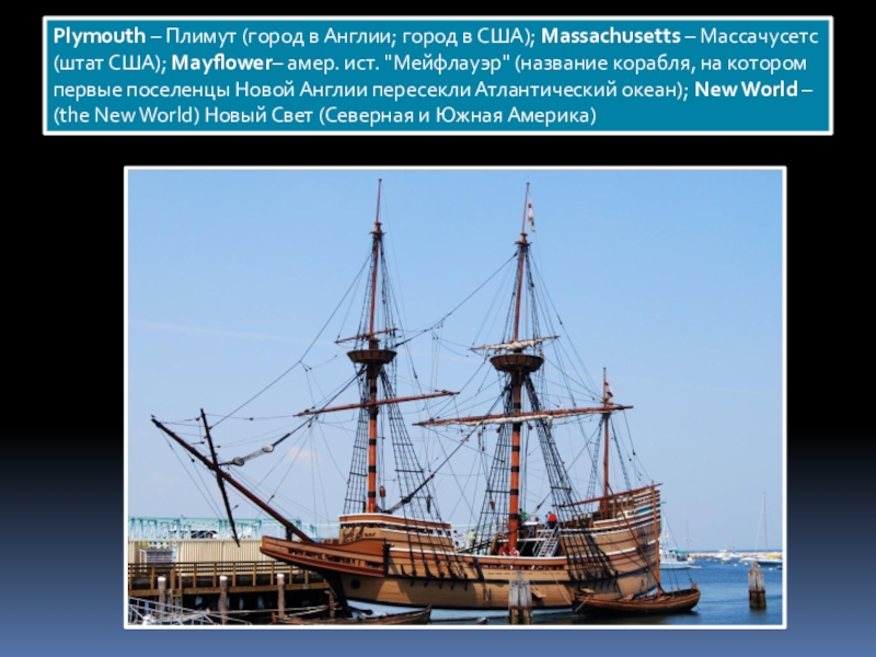 Слайд 3Plymouth – Плимут (город в Англии; город в США); Massachusetts – Массачусетс (штат США); Mayflower–