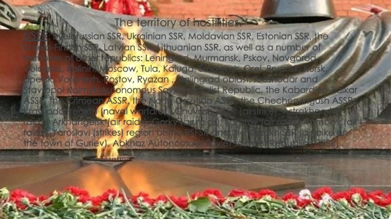 USSR: Byelorussian SSR, Ukrainian SSR, Moldavian SSR, Estonian SSR, the Karelo-Finnish SSR, Latvian SSR, Lithuanian SSR, as well as a number of territories of other republics: Leningrad, Murmansk, Pskov, Novgorod, Vologda, Kalinin, Moscow, Tula, Kaluga, Smolensk, Orel, Bryansk, Kursk, Lipetsk, Voronezh, Rostov, Ryazan , Stalingrad oblast, Krasnodar and Stavropol Kalmyk Autonomous Soviet socialist Republic, the Kabardino-Balkar ASSR, the Crimean ASSR, the North Ossetian ASSR, the Chechen-Ingush ASSR, Krasnodar region (naval warfare) , Chuvash ASSR (airstrike), Astrakhan (air raids), Arkhangelsk (air raids), Gorky (air raids), Saratov (air raids), Tambov (air raids), Yaroslavl (strikes) region of the RSFSR and the Kazakh SSR (airstrike on the town of Guriev), Abkhaz Autonomous Soviet socialist Republic (GSSR)