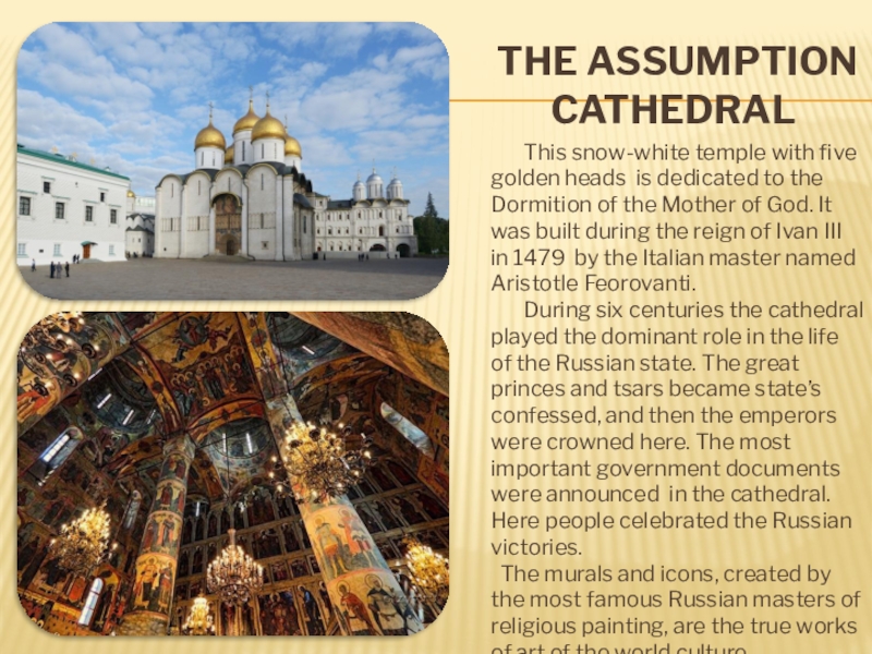 snow-white temple with five golden heads is dedicated to the Dormition of the Mother of God. It was built during the reign of Ivan III in 1479 by the Italian master named Aristotle Feorovanti.