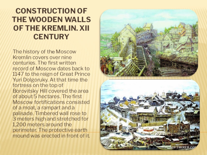 of thе Moscow Kremlin covers over nine centuries. The first written record of Moscow dates back to 1147 to the reign of Great Prince Yuri Dolgoruky. At that time the fortress on the top of Borovitsky Hill covered the area of about 5 hectares. The first Moscow fortifications consisted of a moat, a rampart and a palisade. Timbered wall rose to 3 meters high and stretched for 1,200 meters around the perimeter. The protective earth mound was erected in front of it.