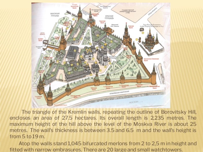 walls, repeating the outline of Borovitsky Hill, encloses an area of 27.5 hectares. Its overall length is 2,235 metres. The maximum height of the hill above the level of the Moskva River is about 25 metres. The wall's thickness is between 3.5 and 6.5 m and the wall’s height is from 5 to 19 m.