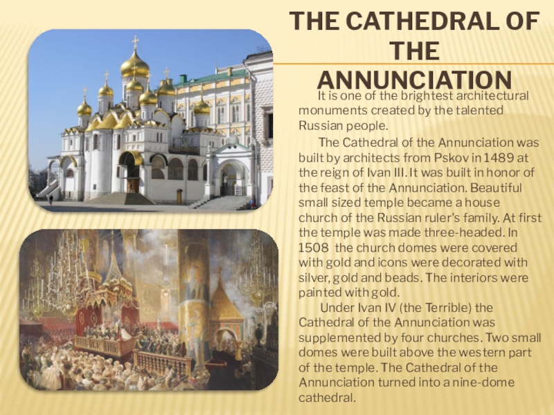 The Cathedral of the Annunciation was built by architects from Pskov in 1489 at the reign of Ivan III. It was built in honor of the feast of the Annunciation. Beautiful small sized temple became a house church of the Russian ruler's family. At first the temple was made three-headed. In 1508 the church domes were covered with gold and icons were decorated with silver, gold and beads. The interiors were painted with gold.