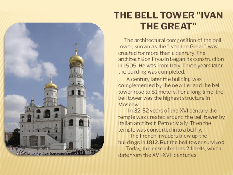 The architectural composition of the bell tower, known as the "Ivan the Great", was created for more than a century. The architect Bon Fryazin began its construction in 1505. He was from Italy. Three years later the building was completed.