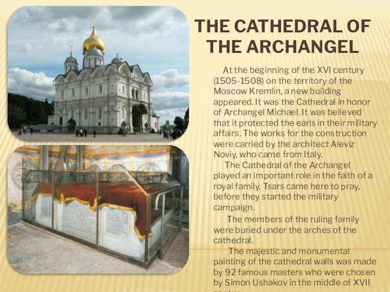 At the beginning of the XVI century (1505-1508) on the territory of the Moscow Kremlin, a new building appeared. It was the Cathedral in honor of Archangel Michael. It was believed that it protected the earls in their military affairs. The works for the construction were carried by the architect Aleviz Noviy, who came from Italy.