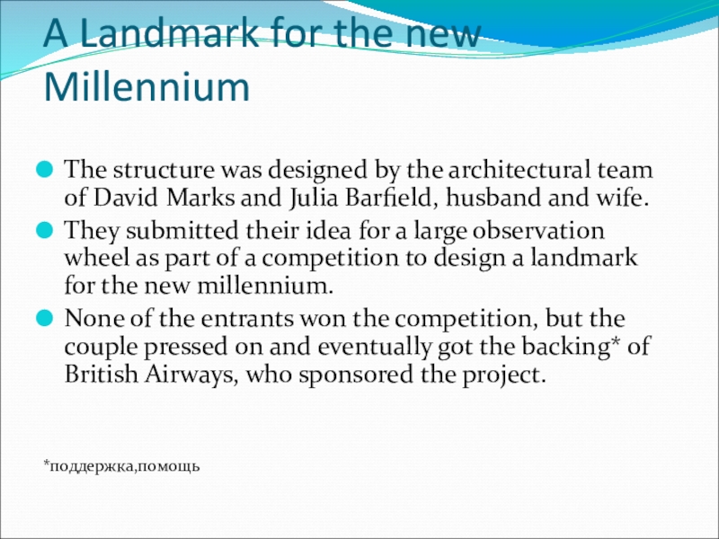 They submitted their idea for a large observation wheel as part of a competition to design a landmark for the new millennium.