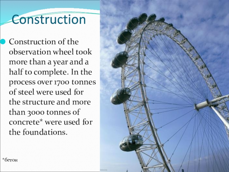 Construction Construction of the observation wheel took more than a year and a half to complete. In