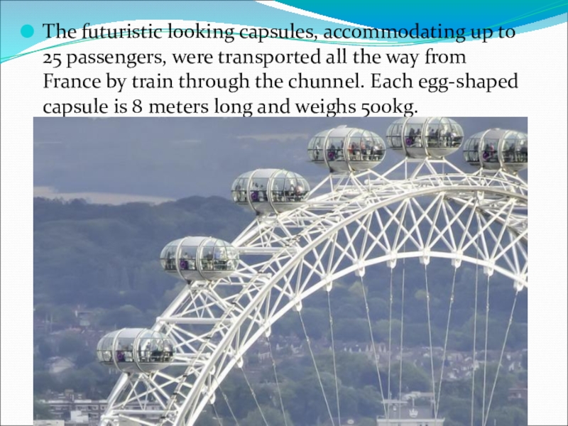 all the way from France by train through the chunnel. Each egg-shaped capsule is 8 meters long and weighs 500kg.