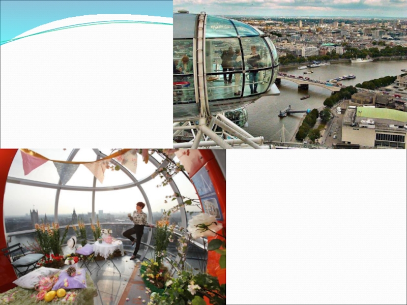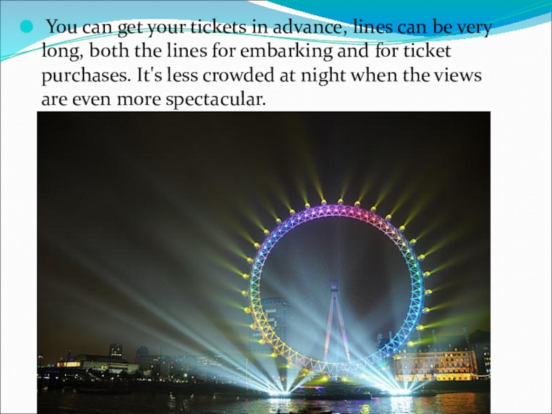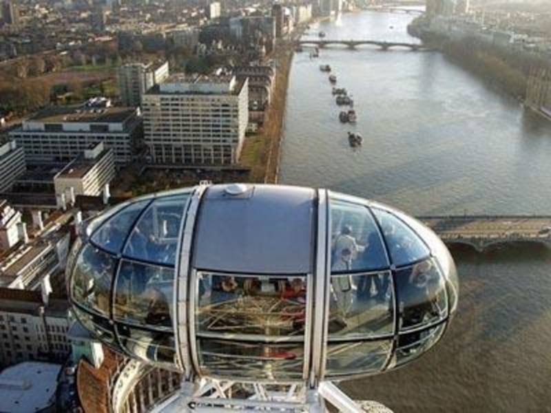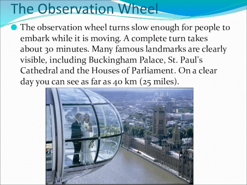 embark while it is moving. A complete turn takes about 30 minutes. Many famous landmarks are clearly visible, including Buckingham Palace, St. Paul's Cathedral and the Houses of Parliament. On a clear day you can see as far as 40 km (25 miles).