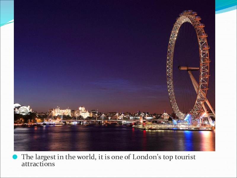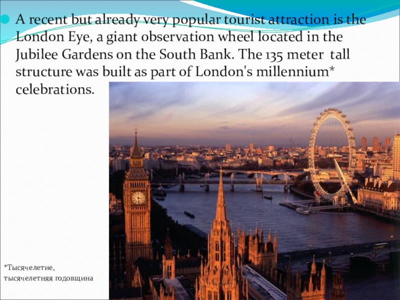 A recent but already very popular tourist attraction is the London Eye, a giant observation wheel located