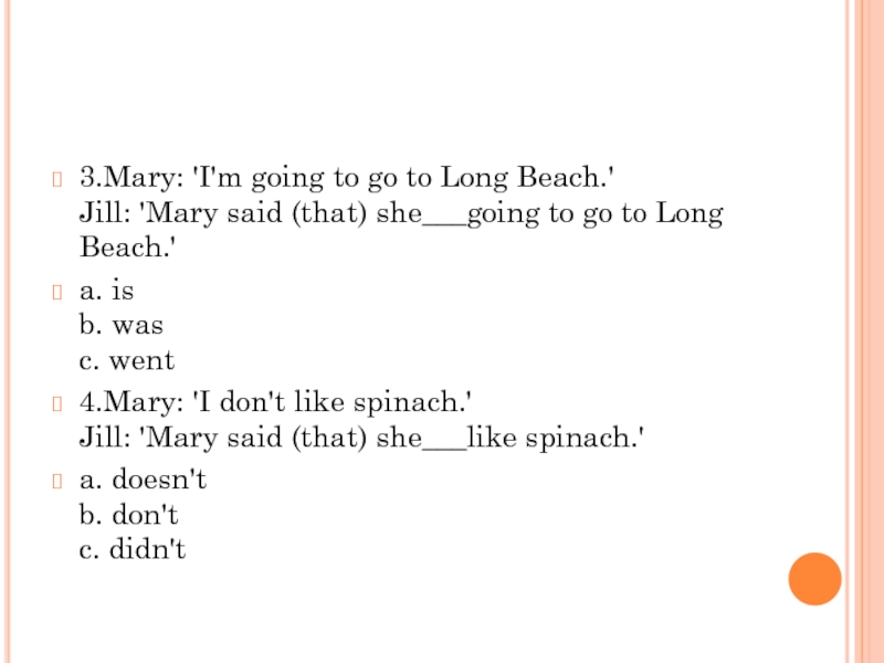 Jill: 'Mary said (that) she___like spinach.'