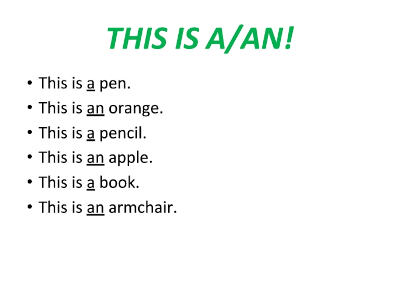 THIS IS A/AN!This is a pen.This is an orange.This is a pencil.This is an apple.This is a