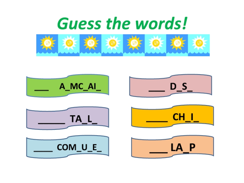 Guess the words!___ A_MC_AI______ TA_L_____ COM_U_E____ D_S_____ CH_I____ LA_P