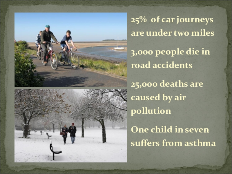 25% of car journeys are under two miles3,000 people die in road accidents25,000 deaths are caused by