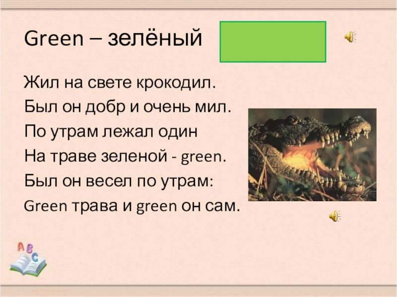 Green – зелёный Жил на свете крокодил. Был он добр и очень мил. По утрам лежал один
