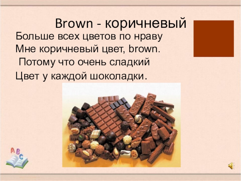Brown - коричневыйБольше всех цветов по нраву Мне коричневый цвет, brown. Потому что очень сладкий Цвет у