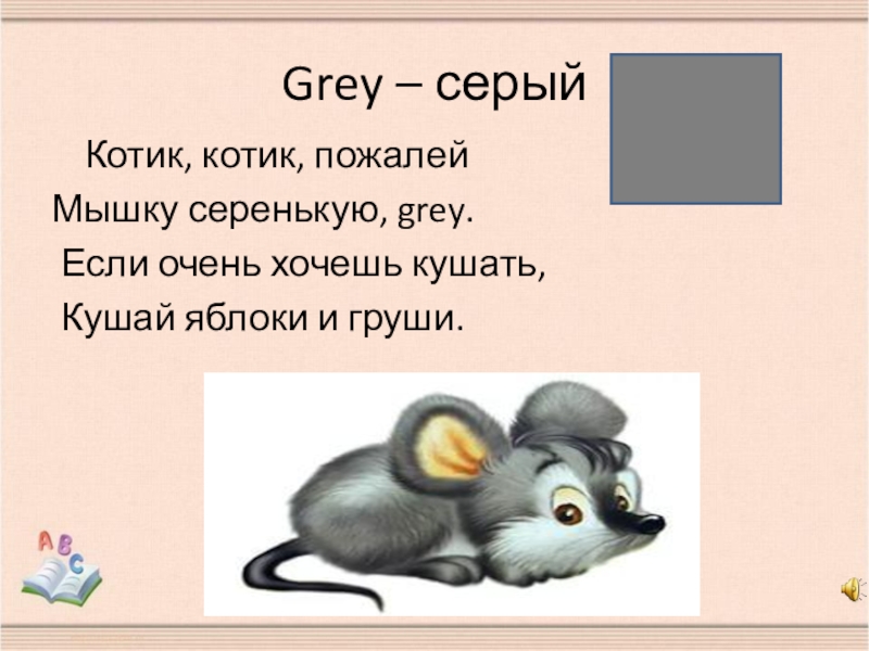 Grey – серый  Котик, котик, пожалей Мышку серенькую, grey. Если очень хочешь кушать, Кушай яблоки и