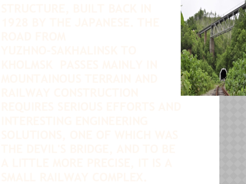 the Japanese. The road from Yuzhno-Sakhalinsk to Kholmsk passes mainly in mountainous terrain and railway construction requires serious efforts and interesting engineering solutions, one of which was the Devil's Bridge, and to be a little more precise, it is a small railway complex.