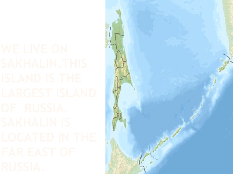 We live оn Sakhalin.this Island is the largest island of Russia. Sakhalin is located in the far