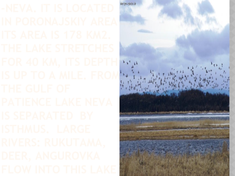 area is 178 km2. The lake stretches for 40 km, its depth is up to a mile. From the Gulf of Patience Lake Neva is separated by isthmus. large rivers: Rukutama, deer, Angurovka flow into this lake