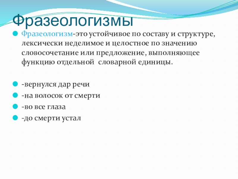 Фразеологизм-это устойчивое по составу и структуре, лексически неделимое и целостное по