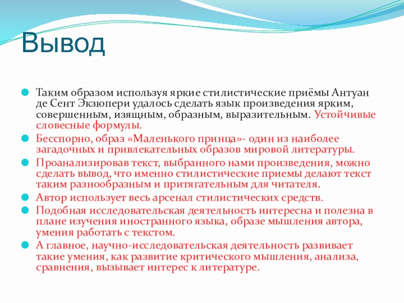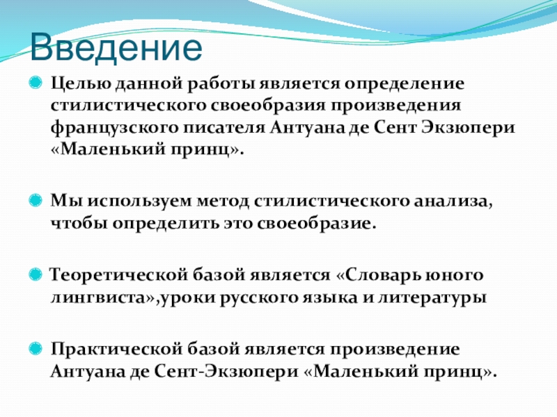 Практической базой является произведение Антуана де Сент-Экзюпери «Маленький принц».