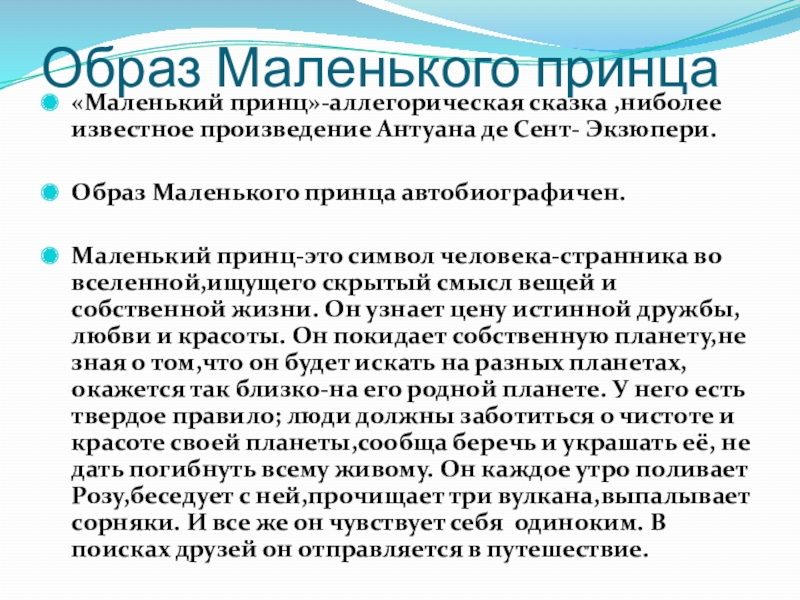 Маленький принц-это символ человека-странника во вселенной,ищущего скрытый смысл вещей и собственной жизни. Он узнает цену истинной дружбы,любви и красоты. Он покидает собственную планету,не зная о том,что он будет искать на разных планетах,окажется так близко-на его родной планете. У него есть твердое правило; люди должны заботиться о чистоте и красоте своей планеты,сообща беречь и украшать её, не дать погибнуть всему живому. Он каждое утро поливает Розу,беседует с ней,прочищает три вулкана,выпалывает сорняки. И все же он чувствует себя одиноким. В поисках друзей он отправляется в путешествие.