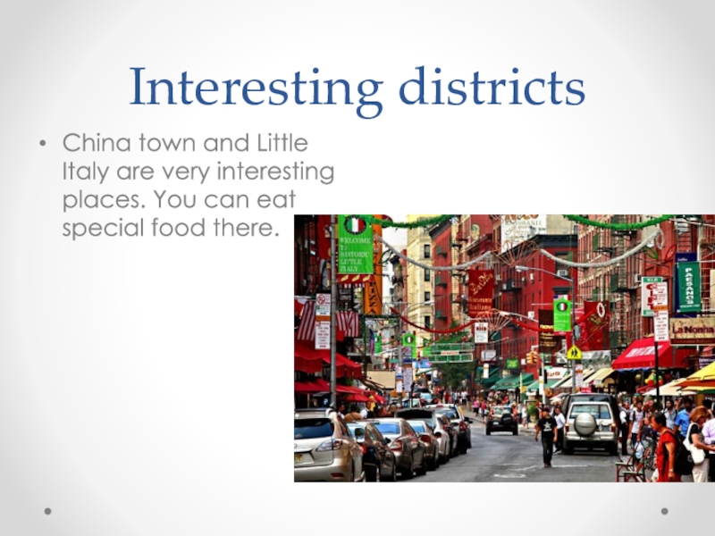 Interesting districtsChina town and Little Italy are very interesting places. You can eat special food there.