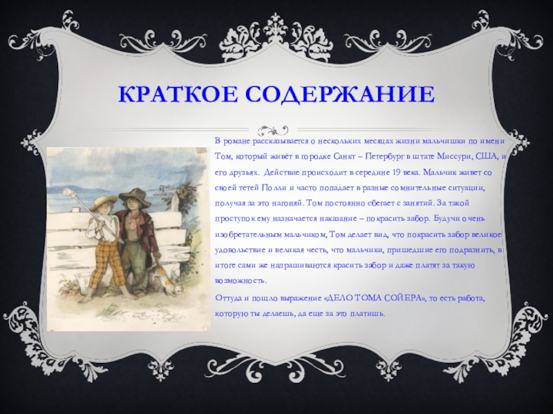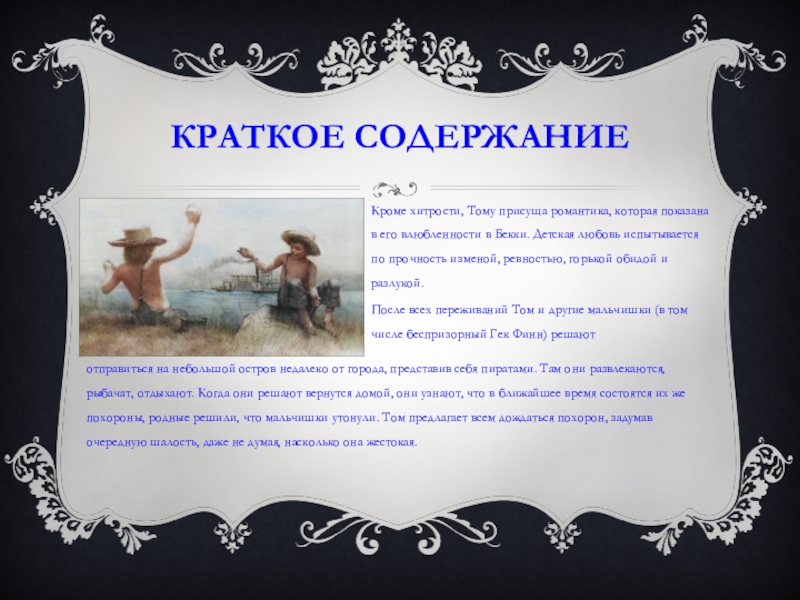 отправиться на небольшой остров недалеко от города, представив себя пиратами. Там они развлекаются, рыбачат, отдыхают. Когда они решают вернутся домой, они узнают, что в ближайшее время состоятся их же похороны, родные решили, что мальчишки утонули. Том предлагает всем дождаться похорон, задумав очередную шалость, даже не думая, насколько она жестокая.