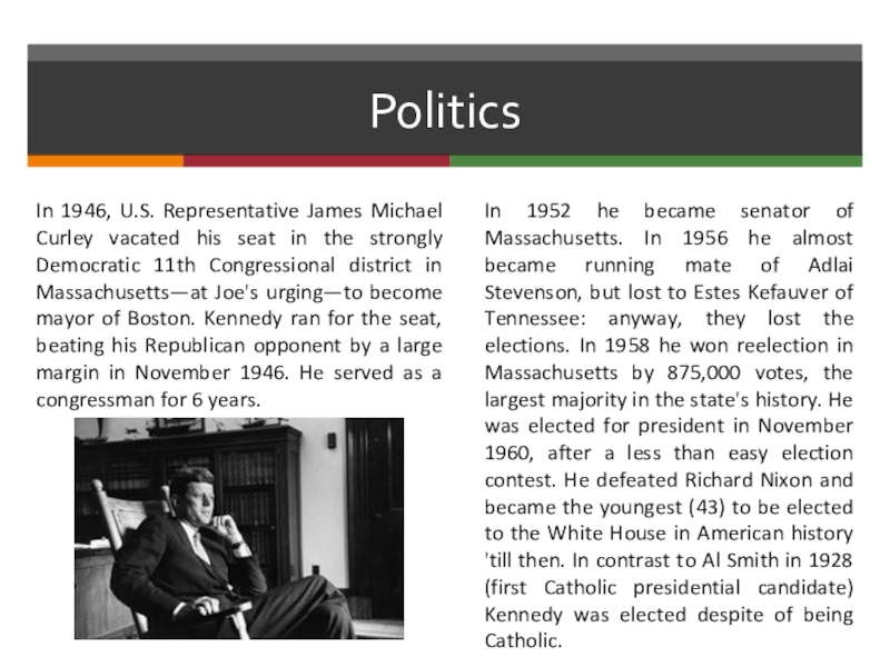 In 1946, U.S. Representative James Michael Curley vacated his seat in the strongly Democratic 11th Congressional district in Massachusetts—at Joe's urging—to become mayor of Boston. Kennedy ran for the seat, beating his Republican opponent by a large margin in November 1946. He served as a congressman for 6 years.