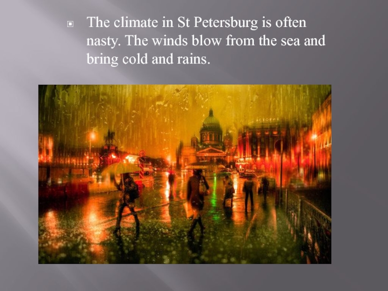 Слайд 5The climate in St Petersburg is often nasty. The winds blow