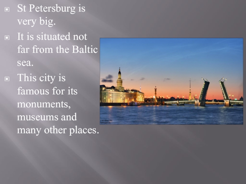 St Petersburg is very big.It is situated not far from the Baltic sea.This city is famous for its monuments, museums and many other places.