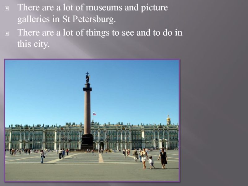 There are a lot of museums and picture galleries in St Petersburg.There are a lot of things