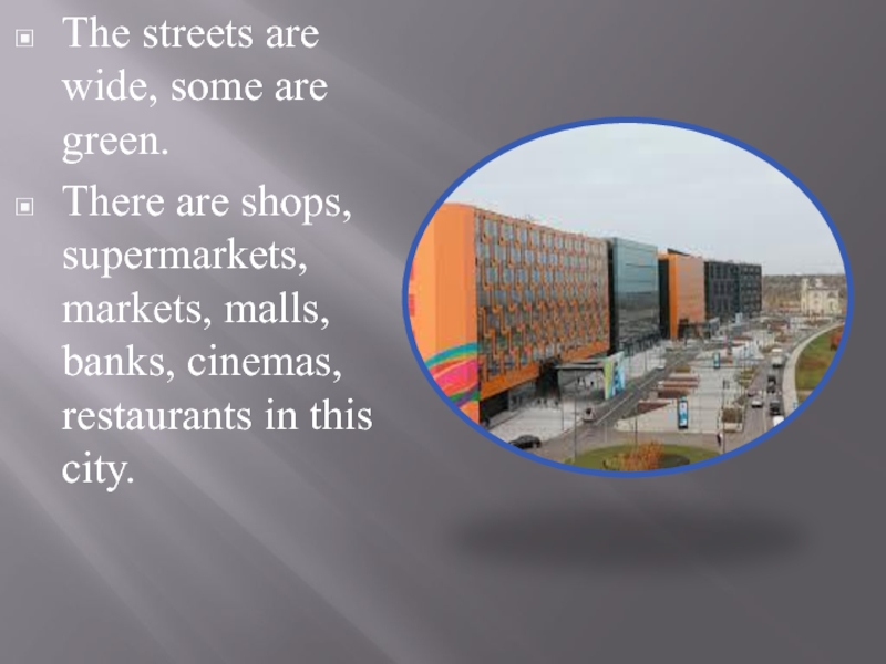 The streets are wide, some are green.There are shops, supermarkets, markets, malls, banks, cinemas, restaurants in this