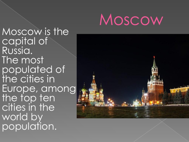 MoscowMoscow is the capital of Russia.The most populated of the cities in Europe, among the top ten
