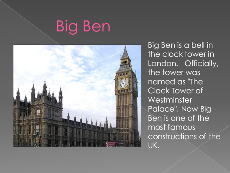 Big BenBig Ben is a bell in the clock tower in London.   Officially, the tower was named as "The Clock Tower of Westminster Palace". Now Big Ben is one of the most famous constructions of the