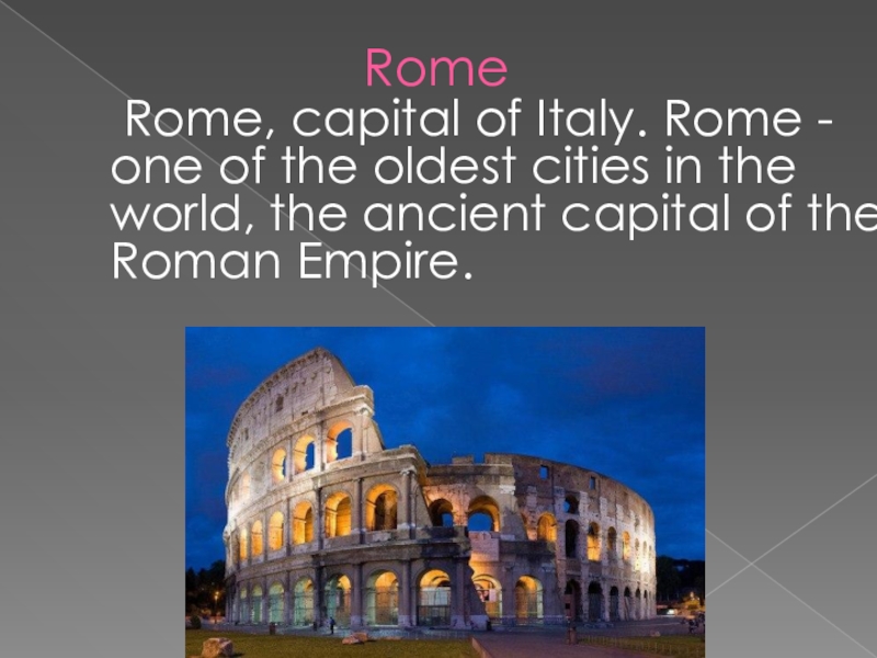 Rome  Rome, capital of Italy. Rome - one of the oldest cities in the world,