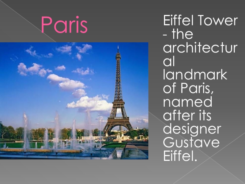 ParisEiffel Tower - the architectural landmark of Paris, named after its designer Gustave Eiffel.