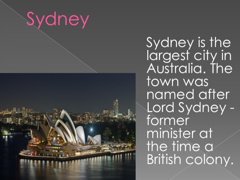 SydneySydney is the largest city in Australia. The town was named after Lord Sydney - former minister