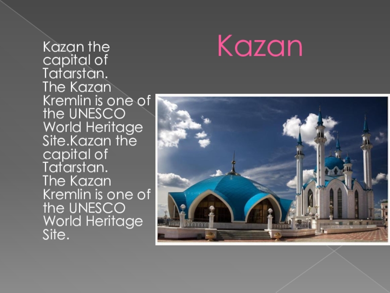 KazanKazan the capital of Tatarstan.The Kazan Kremlin is one of the UNESCO World Heritage Site.Kazan the capital