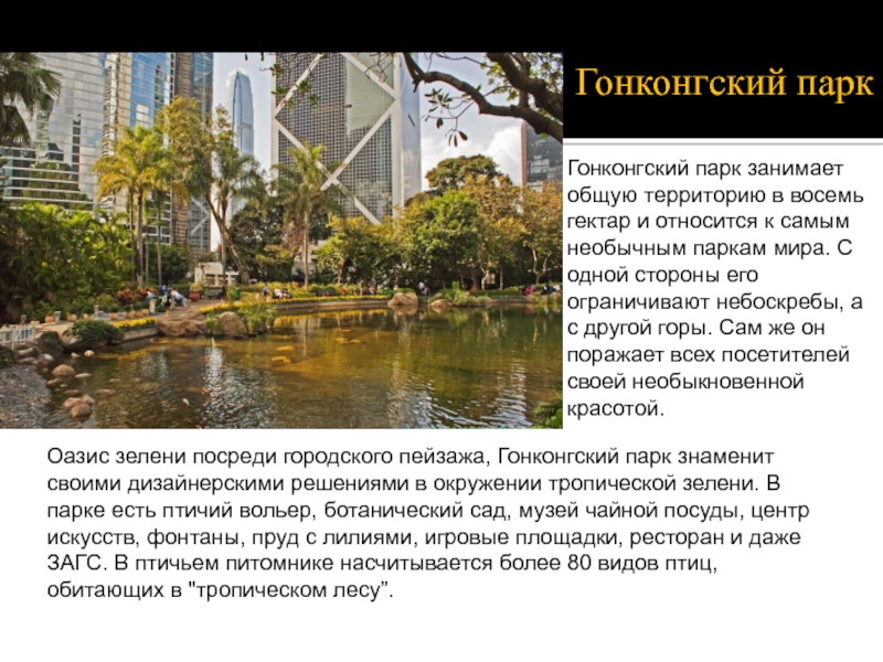Гонконгский парк занимает общую территорию в восемь гектар и относится к самым необычным паркам мира. С одной стороны его ограничивают небоскребы, а с другой горы. Сам же он поражает всех посетителей своей необыкновенной красотой.
