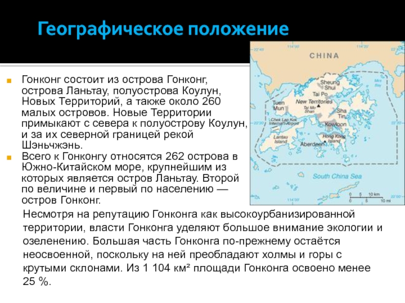 Несмотря на репутацию Гонконга как высокоурбанизированной территории, власти Гонконга уделяют большое внимание экологии и озеленению. Большая часть Гонконга по-прежнему остаётся неосвоенной, поскольку на ней преобладают холмы и горы с крутыми склонами. Из 1 104 км² площади Гонконга освоено менее 25 %.