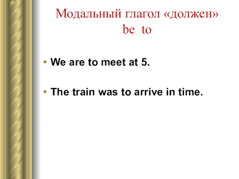 Модальный глагол «должен» be toWe are to meet at 5.The train was to arrive in time.