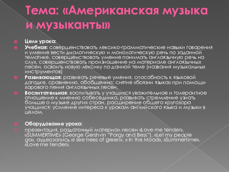 презентация, раздаточный материал песен «Love me tender», «SUMMERTIME» (George Gershvin “Porgy and Bess”), «Let my people go», аудеозапись «I see trees of green», « In the Mood», «Summertime», «Love me tender».