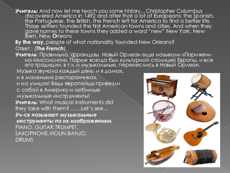 Учитель: Правильно, французы. Новый Орлеан еще называли «Парижем-на-Миссисипи». Париж всегда был культурной столицей Европы, и все его традиции, в т.ч. и музыкальные, перенеслись в Новый Орлеан.