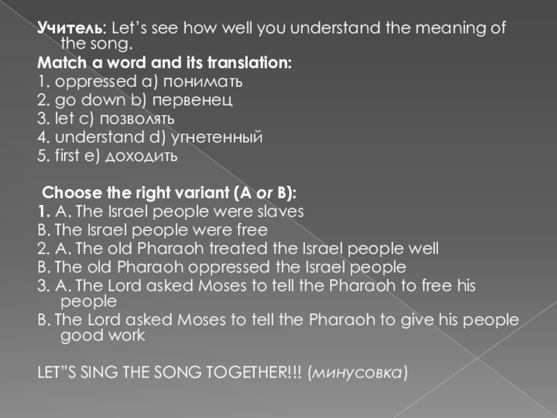 Слайд 7Учитель: Let’s see how well you understand the meaning of the song.
