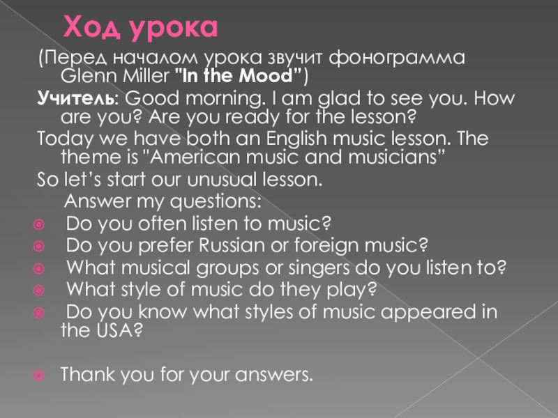 (Перед началом урока звучит фонограмма Glenn Miller "In the Mood”)