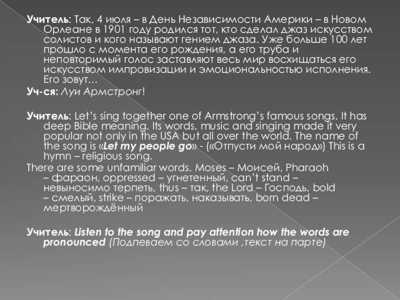 Учитель: Let’s sing together one of Armstrong’s famous songs. It has deep Bible meaning. Its words, music and singing made it very popular not only in the USA but all over the world. The name of the song is «Let my people go» - («Отпусти мой народ») This is a hymn – religious song.