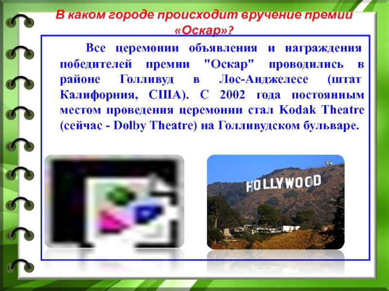 Слайд 16В каком городе происходит вручение премии «Оскар»?