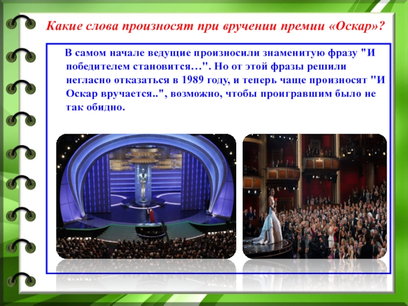 Слайд 19Какие слова произносят при вручении премии «Оскар»?