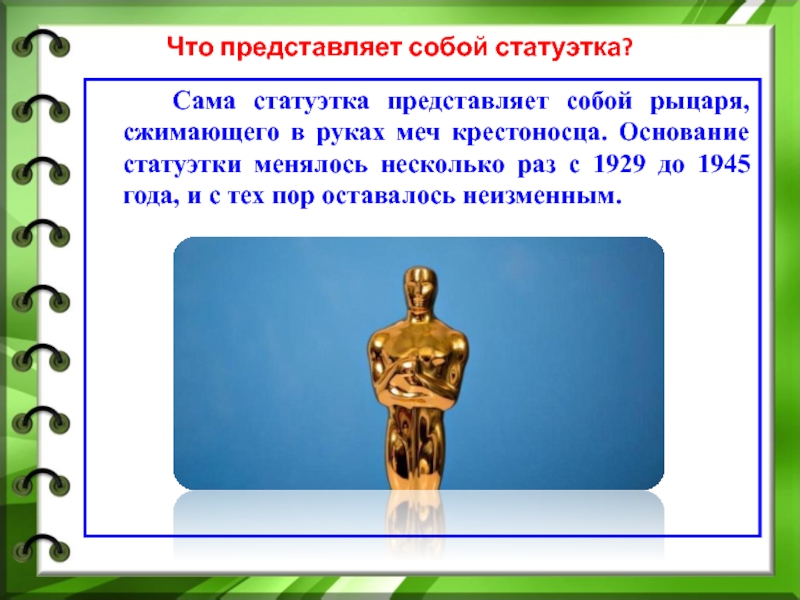 рыцаря, сжимающего в руках меч крестоносца. Основание статуэтки менялось несколько раз с 1929 до 1945 года, и с тех пор оставалось неизменным.